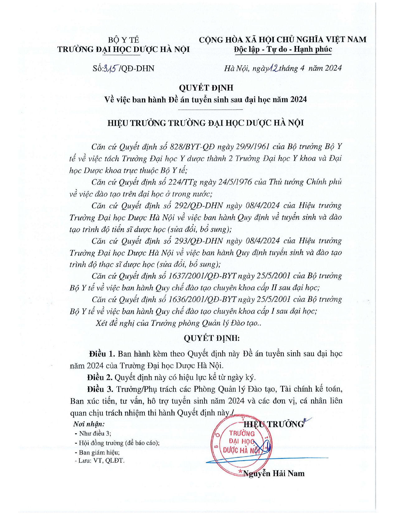 Căn cứ chỉ tiêu tuyển sinh đào tạo trình độ tiến sĩ và thạc sĩ đã xác định năm 2024, Trường Đại học Dược Hà Nội thông báo tuyển sinh đào tạo trình độ tiến sĩ và thạc sĩ năm 2024 như sau